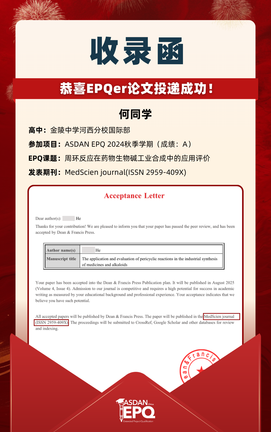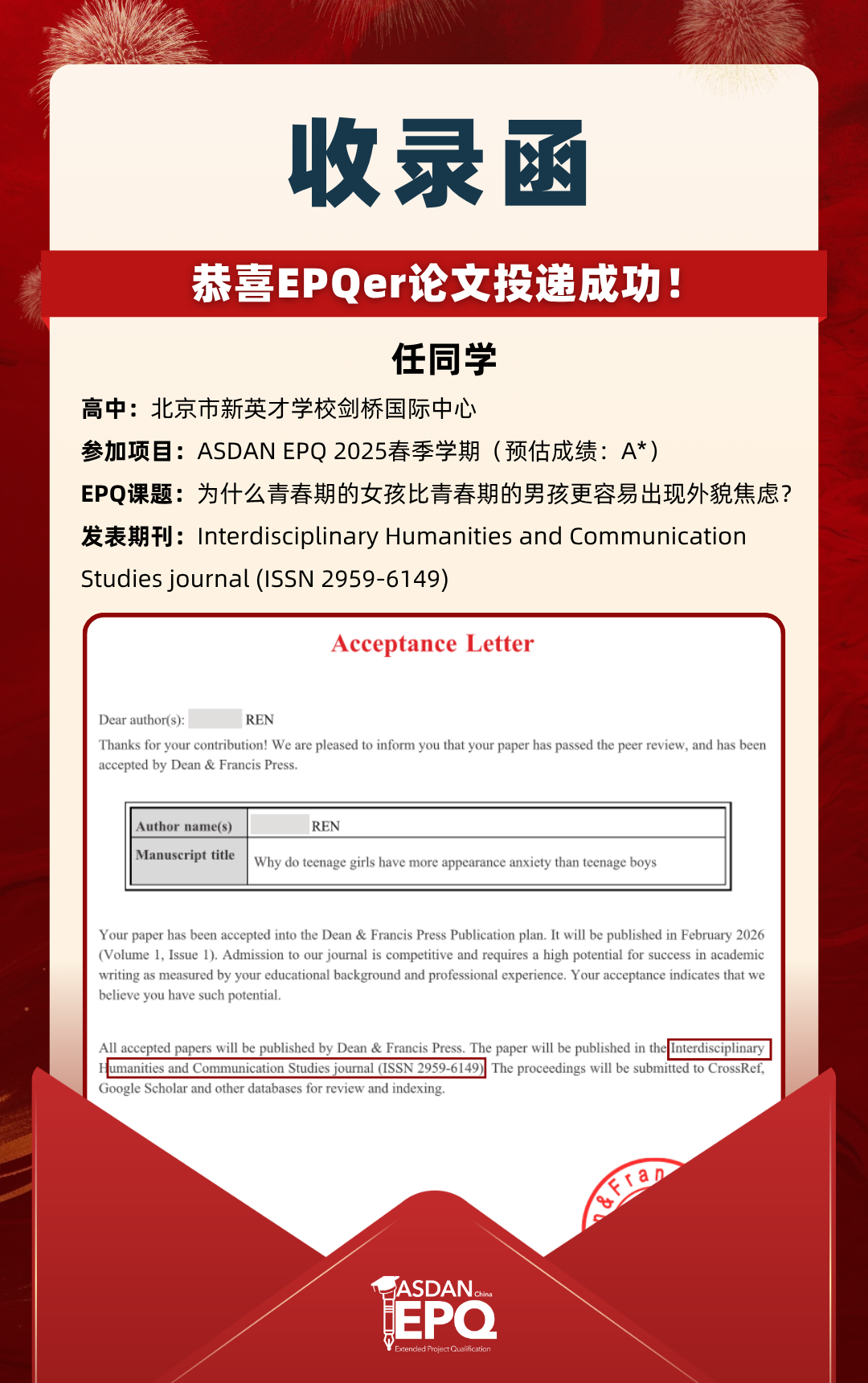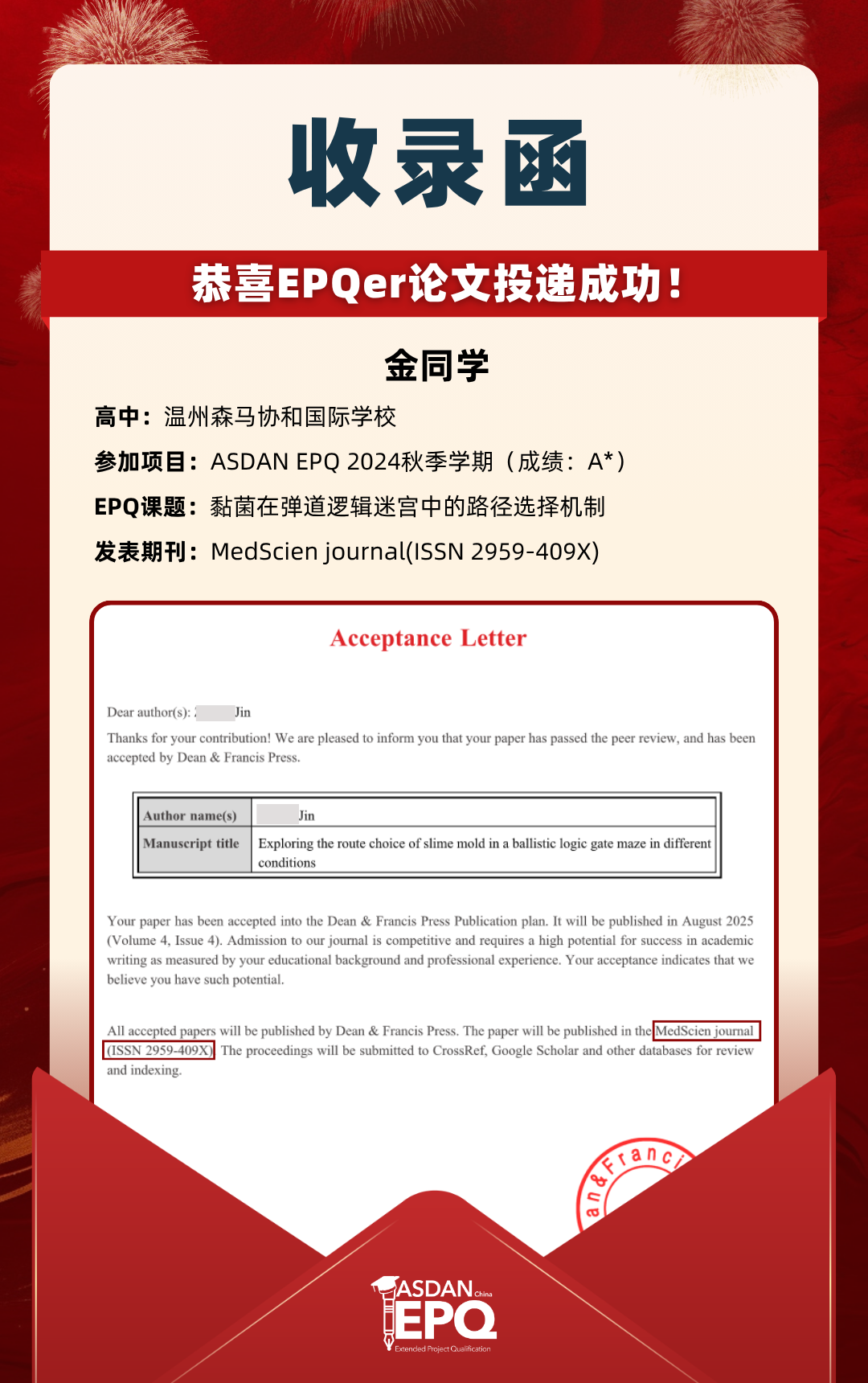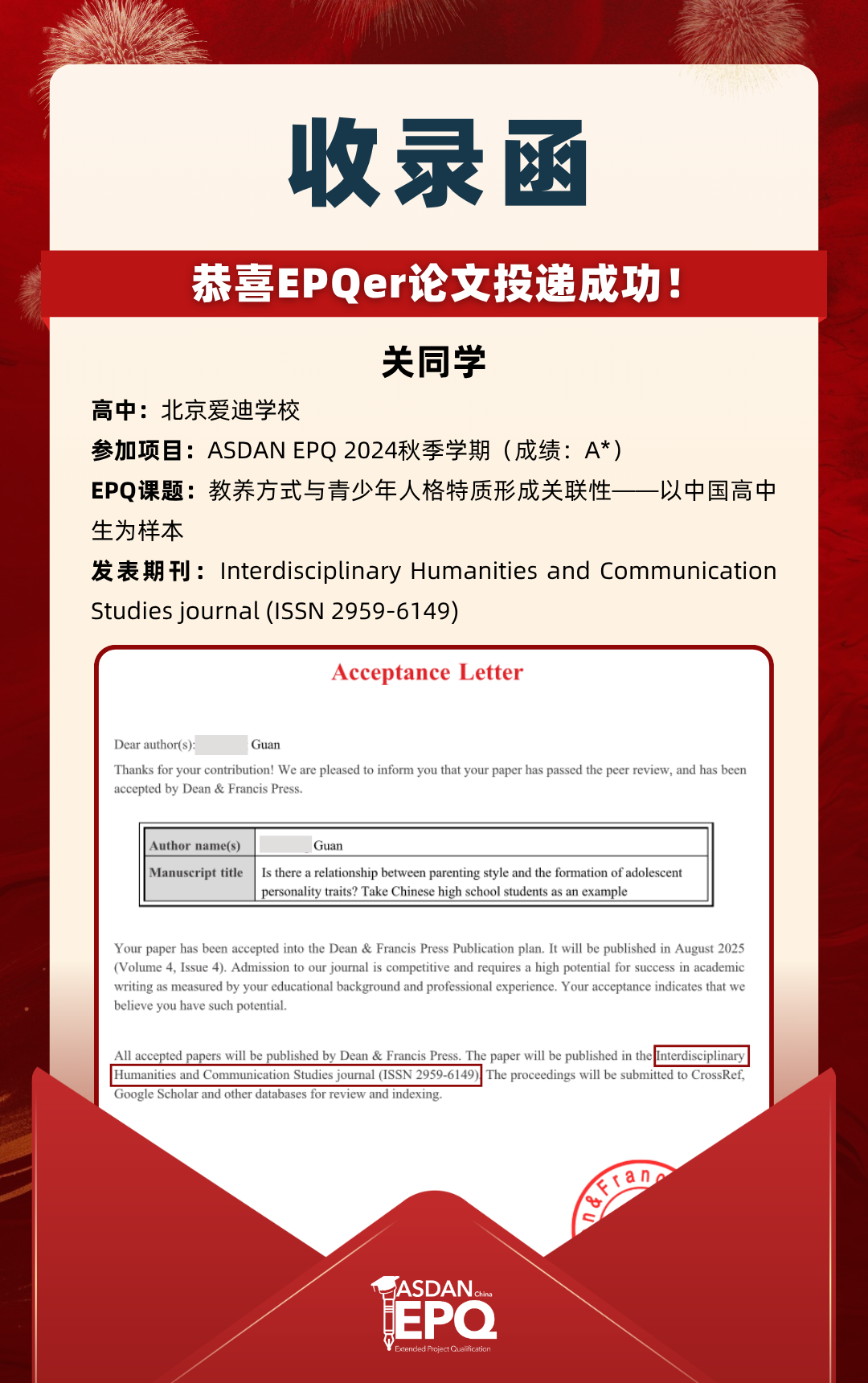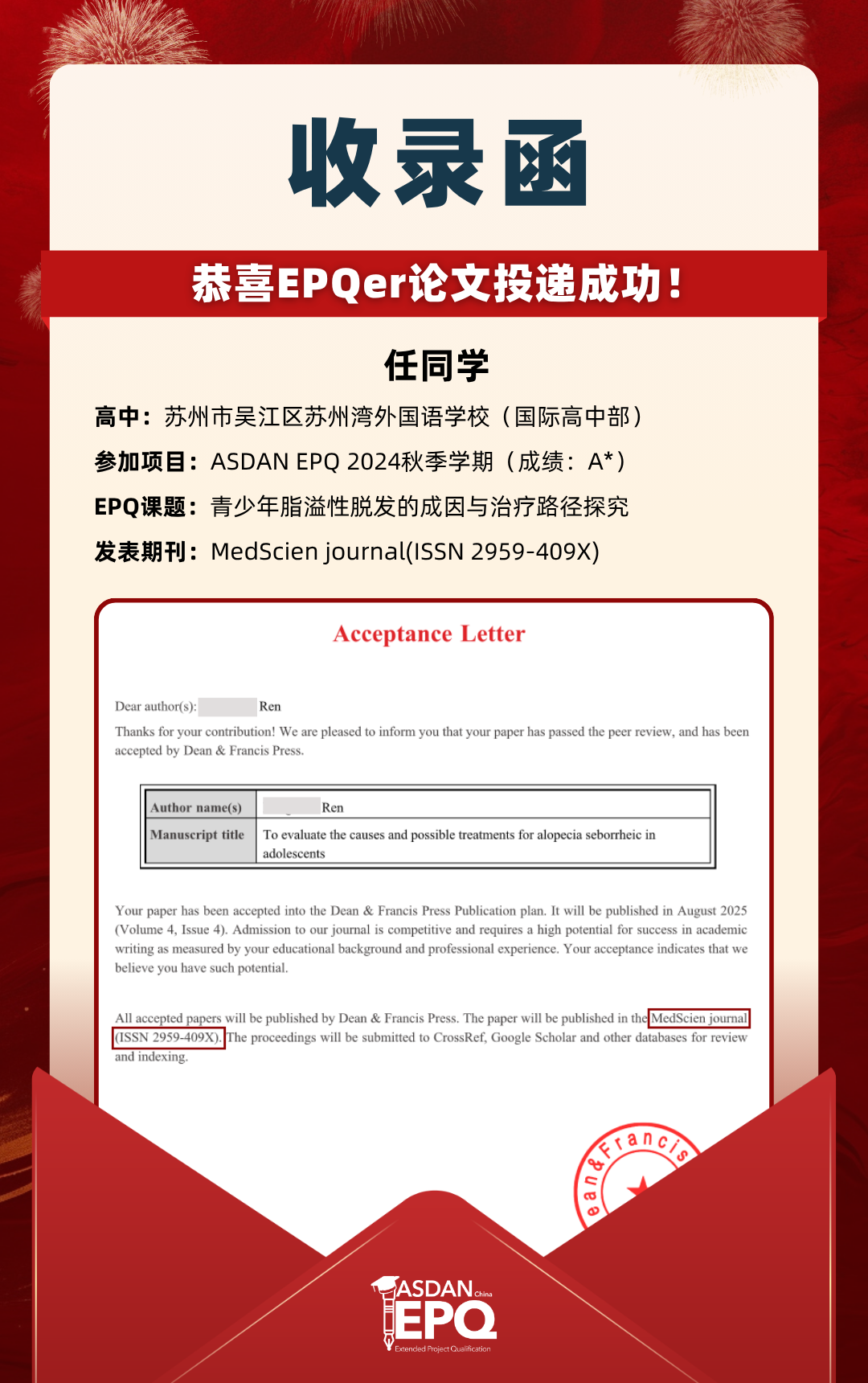 阿思丹鼓励优秀的高中生进行科研创作,并协助学员将稿件投递至高质量的学术期刊。在大学申请中,高校普遍希望获得额外的学术材料支持。科研论文发表,可以真实、客观、强有力地证明学生的综合学术实力,降低招生官决策门槛,让申请者获得更高的认可!