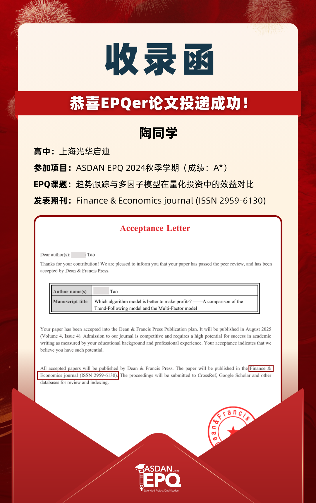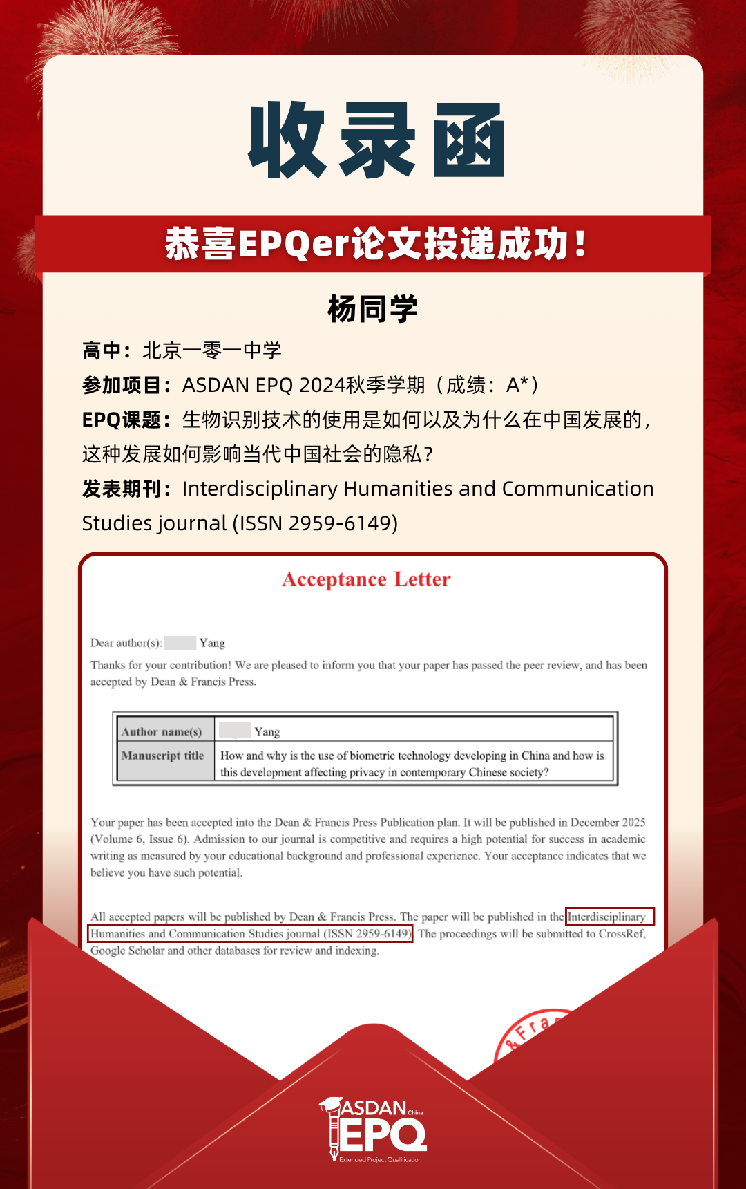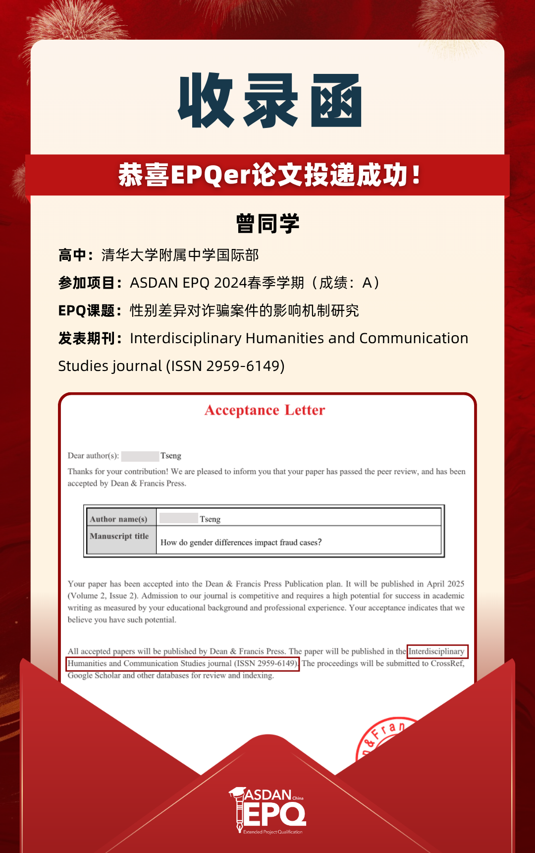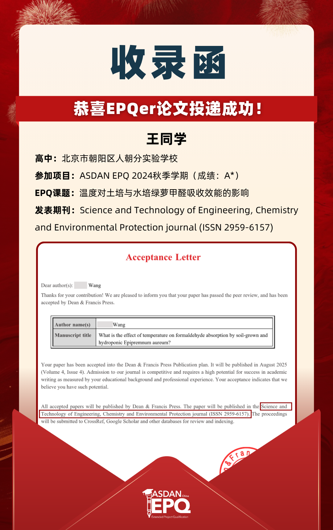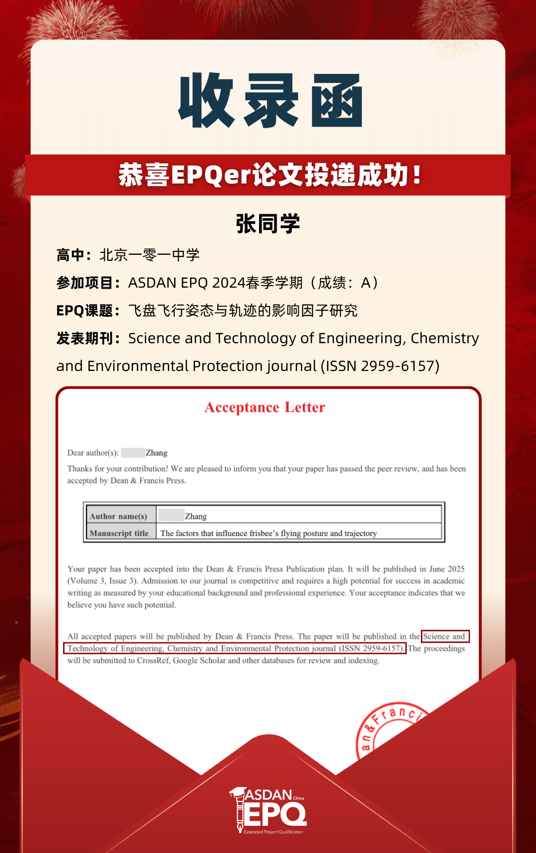 阿思丹鼓励优秀的高中生进行科研创作,并协助学员将稿件投递至高质量的学术期刊。在大学申请中,高校普遍希望获得额外的学术材料支持。科研论文发表,可以真实、客观、强有力地证明学生的综合学术实力,降低招生官决策门槛,让申请者获得更高的认可!
