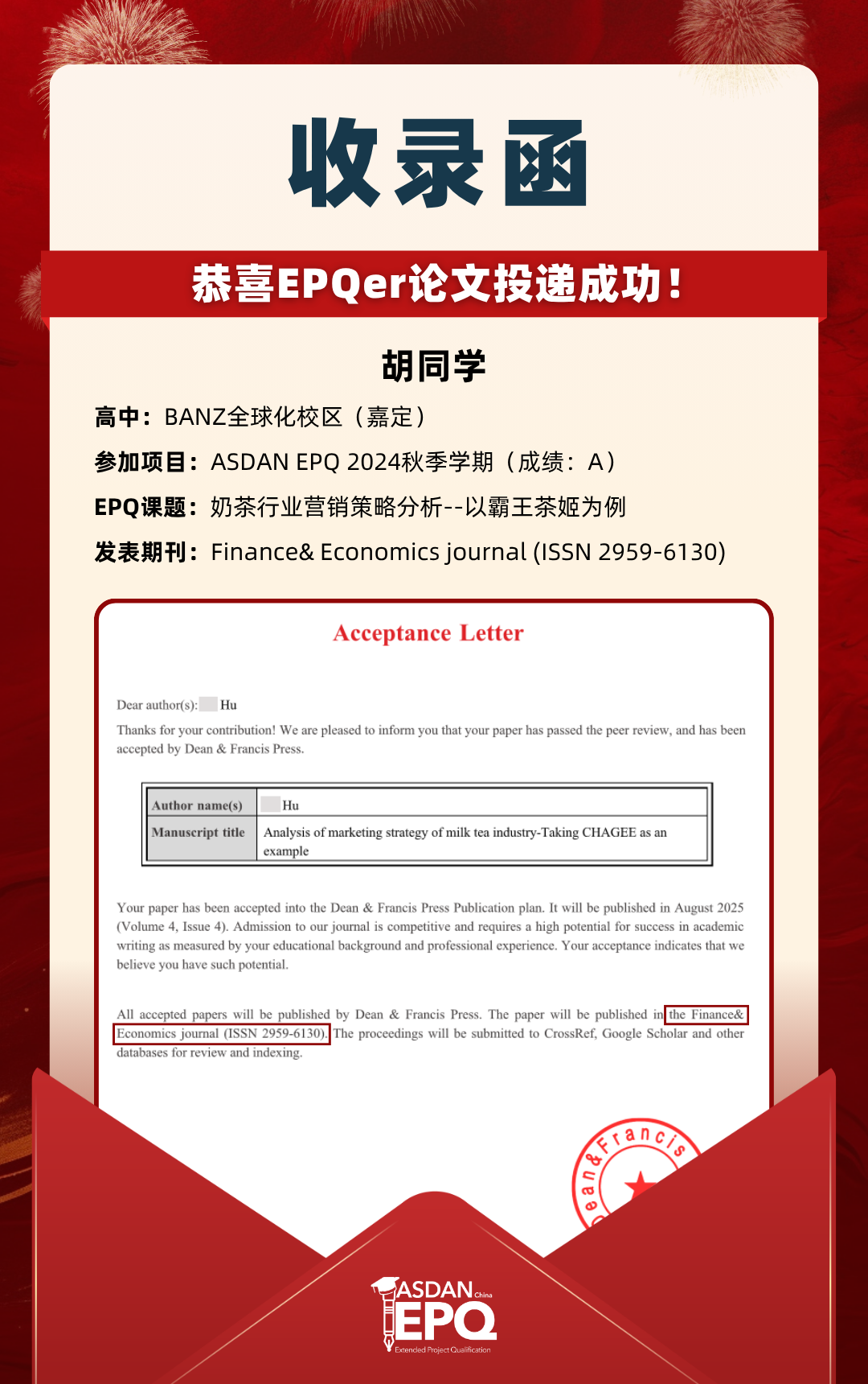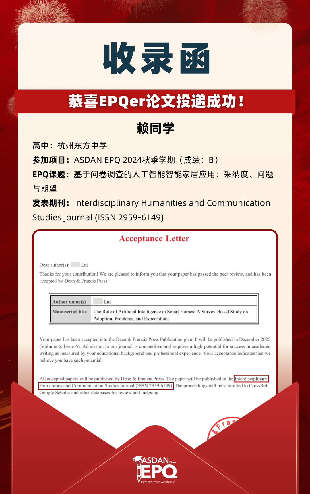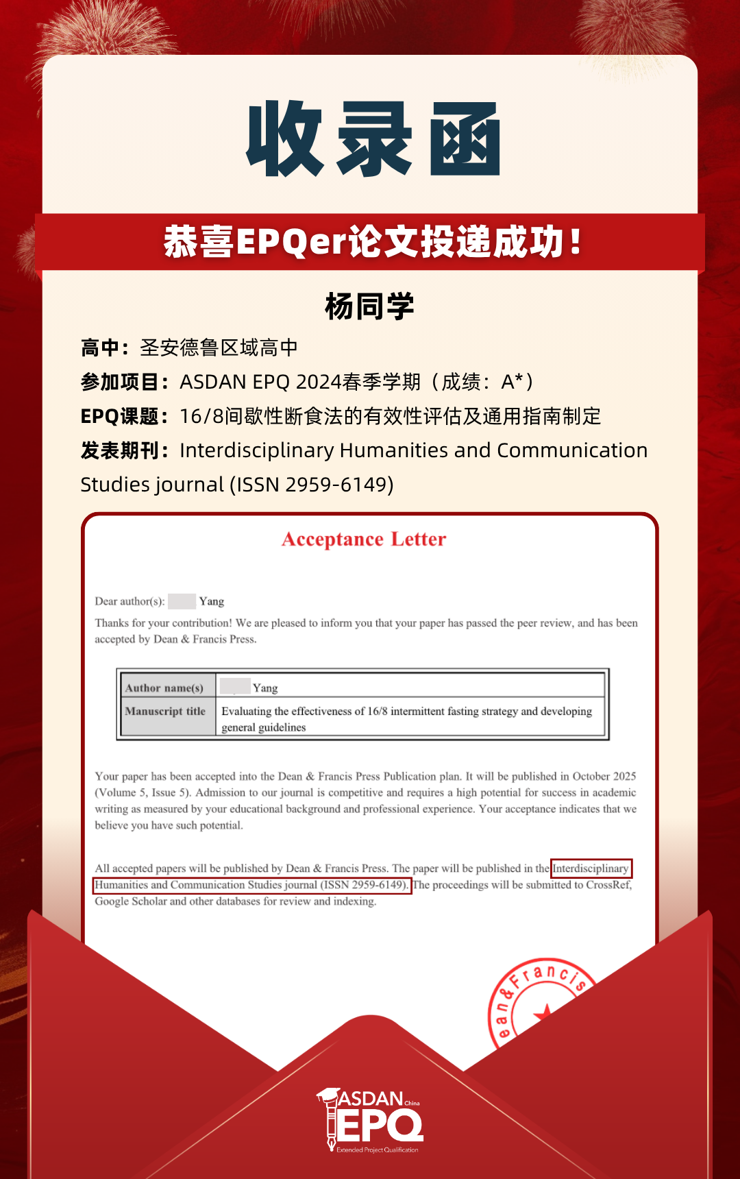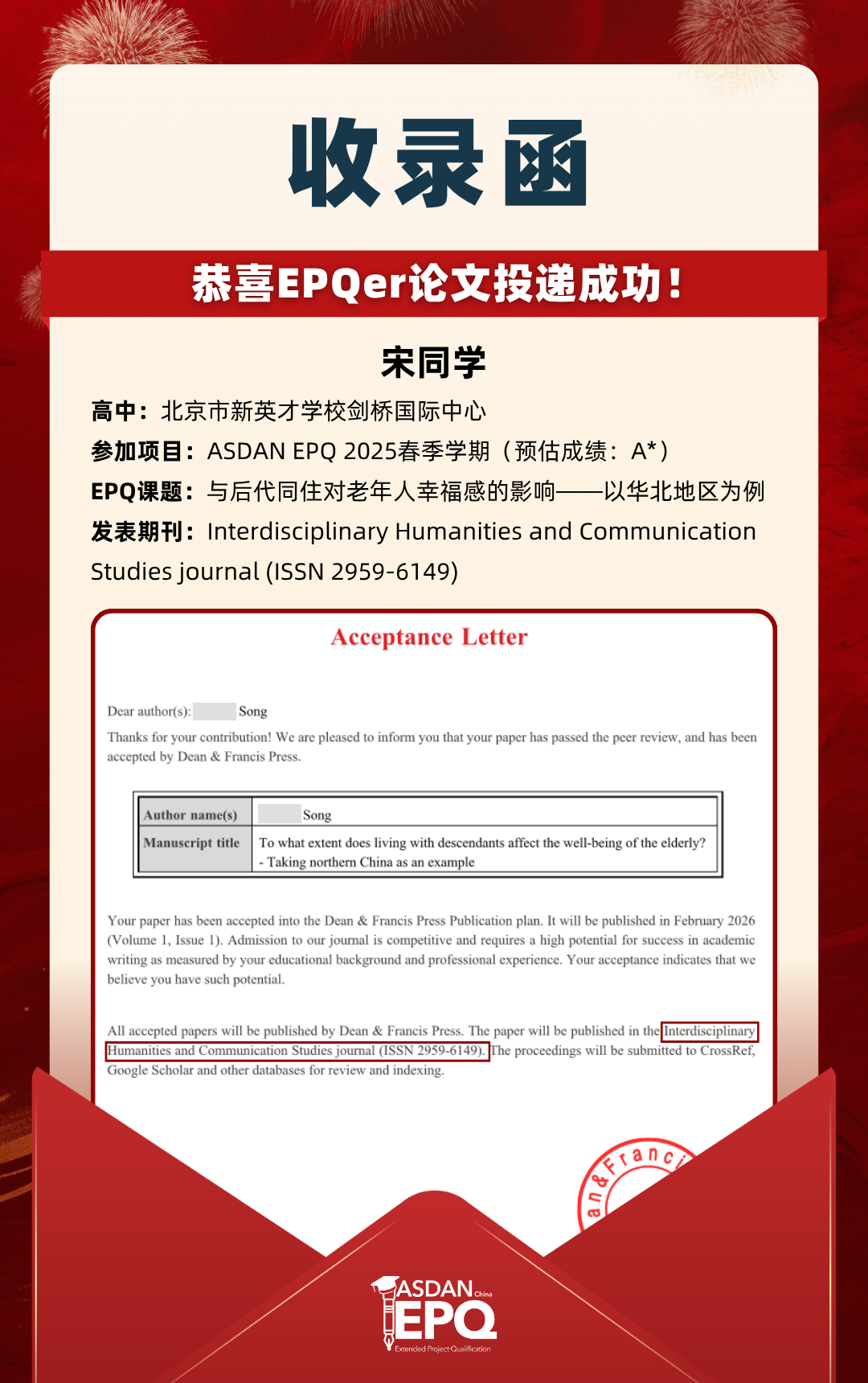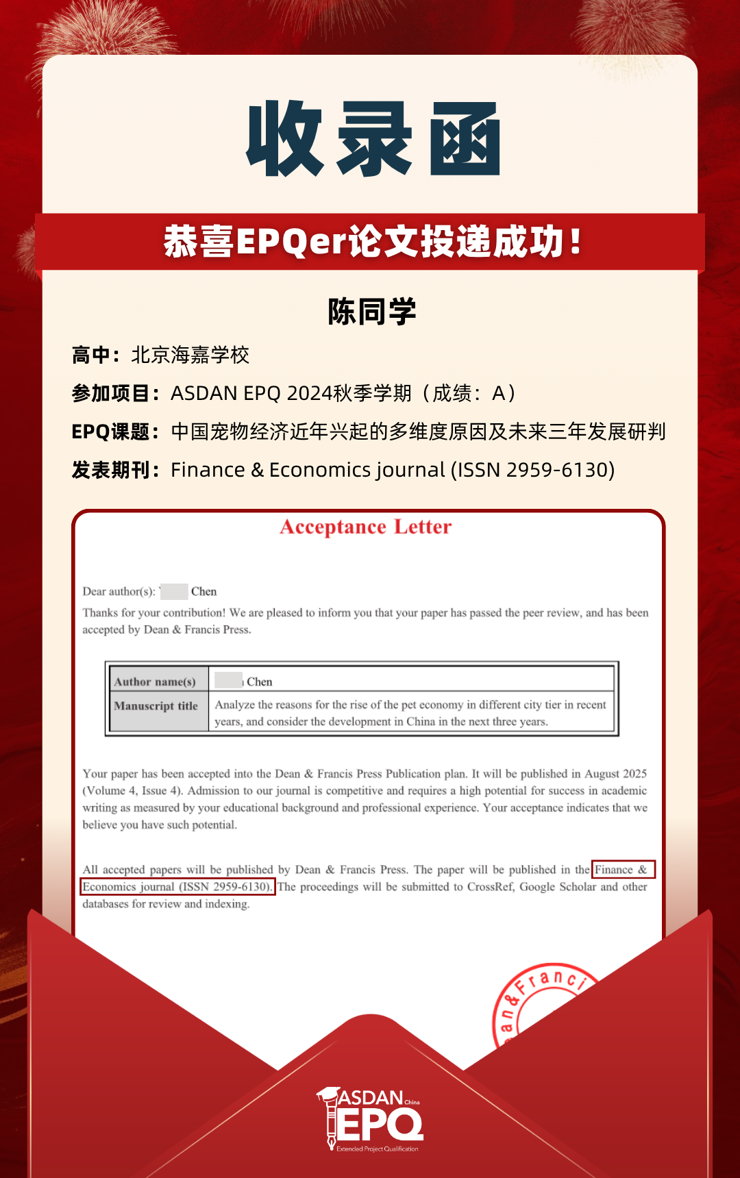 阿思丹鼓励优秀的高中生进行科研创作,并协助学员将稿件投递至高质量的学术期刊。在大学申请中,高校普遍希望获得额外的学术材料支持。科研论文发表,可以真实、客观、强有力地证明学生的综合学术实力,降低招生官决策门槛,让申请者获得更高的认可!